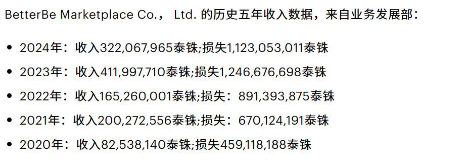 但从结果来看,这一转型并未改变平台的盈利能力。根据公开数据,BetterBe在2020年至2024年持续亏损,累计亏损约43.91亿泰铢(约合人民币9.8亿元),其中2024年营收仅约3.22亿泰铢,却亏损达11.23亿泰铢。