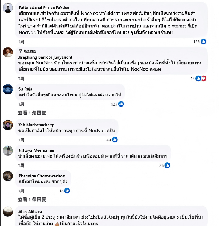 NocNoc的离场,在用户中激起了广泛的不舍与担忧。在Facebook的告别贴的评论区里,许多人表达了对NocNoc的不舍与惋惜,认为它是泰国服务行业的优质选择,为生活带来了诸多便利;