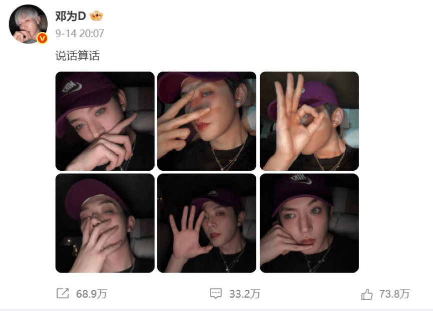 邓为则在粉丝心愿卡环节抽中“拍4-6张潮男并发微博”心愿卡后,当场承诺活动结束立刻拍摄,在当晚就在微博晒出了潮男主题六连拍回应粉丝期待。